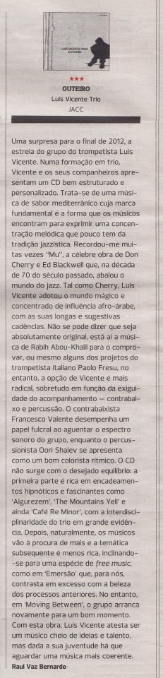 Image Recensão sobre o disco “Outeiro”, Luís Vicente Trio, Jacc Records, 2012 Share this: Click to share on X (Opens in new window) X Click to share on Facebook (Opens in new window) Facebook More Click to share on WhatsApp (Opens in new window) WhatsApp Click to email a link to a friend (Opens in new window) Email Click to share on Telegram (Opens in new window) Telegram Like Loading... Related