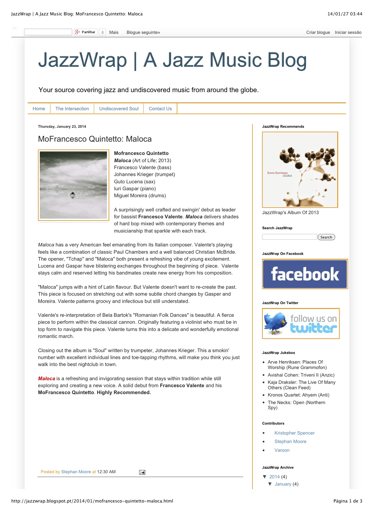 Image “Maloca” review on Jazzwrap! http://jazzwrap.blogspot.pt/2014/01/mofrancesco-quintetto-maloca.html Share this: Click to share on X (Opens in new window) X Click to share on Facebook (Opens in new window) Facebook More Click to share on WhatsApp (Opens in new window) WhatsApp Click to email a link to a friend (Opens in new window) Email Click to share on Telegram (Opens in new window) Telegram Like Loading... Related